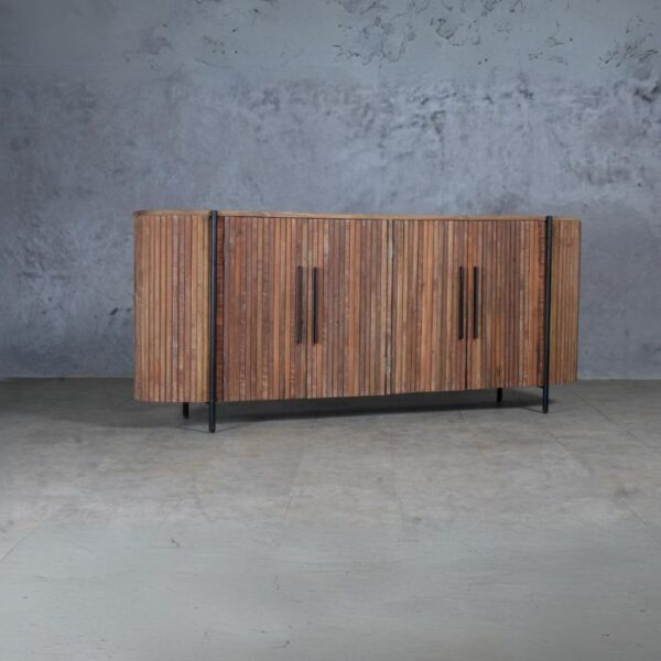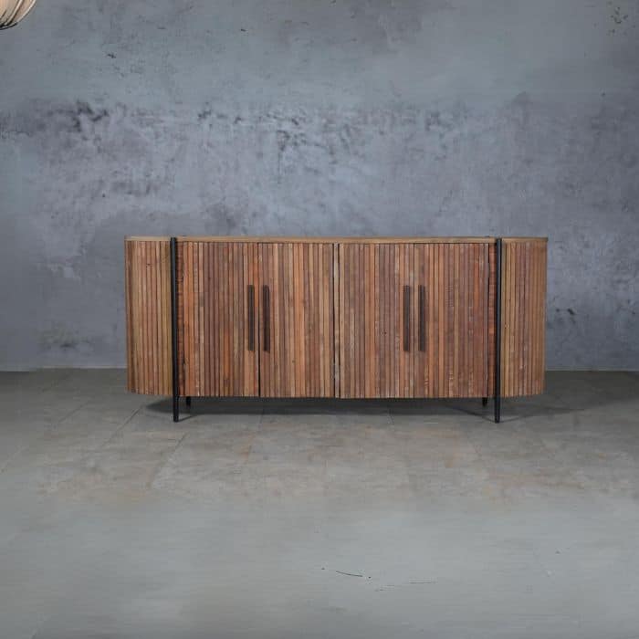 שידה מעץ טיק מלא ממוחזר בעלת 4 דלתות, מבנה השידה מעוגל.