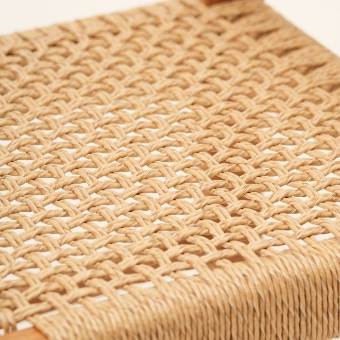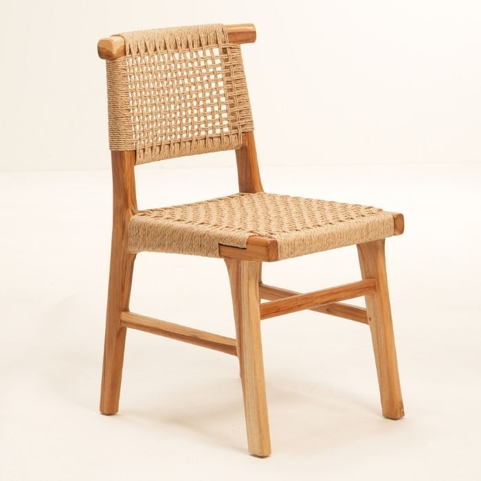 כסא אוכל מעץ טיק מלא בשילוב גב ומושב קלועים מראטן סינטטי איכותי.