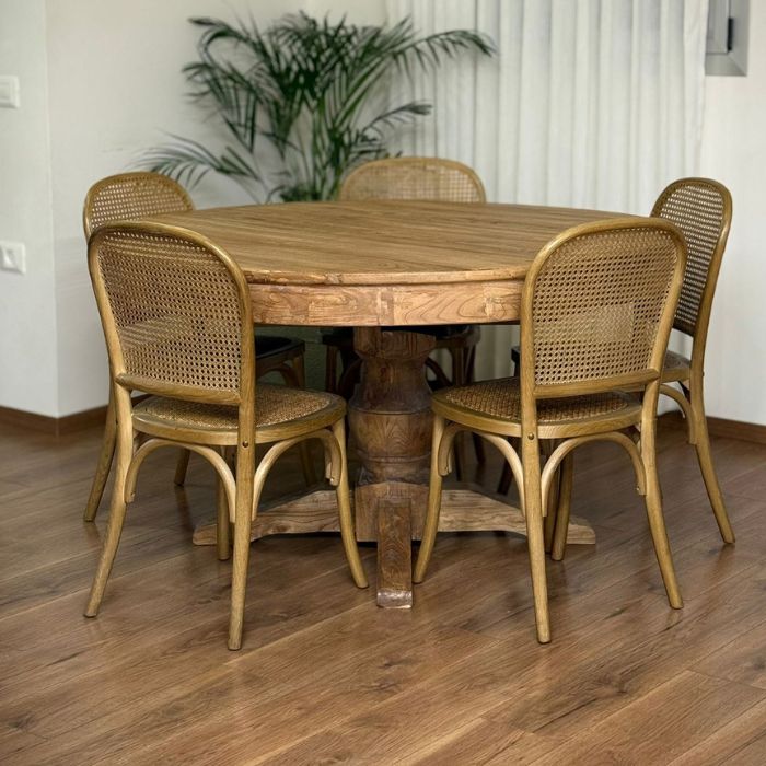 שולחן אוכל עגול מעוצב מעץ מלא ממוחזר עם רגל גביע אמצעית, בעל מראה כפרי וטבעי.