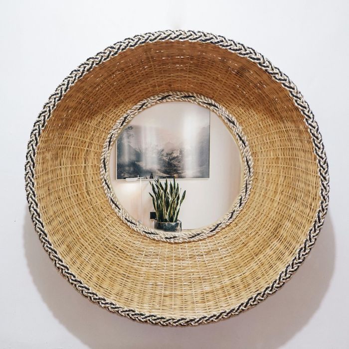 מראה מראטן טבעי עגולה עם מסגרת קלועה בעבודת יד