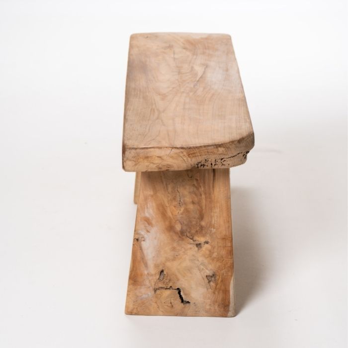 ספסל כפרי לחצר או פנים הבית, עשוי מפלטת עץ טיק מונחת על רגליים מעץ טיק .