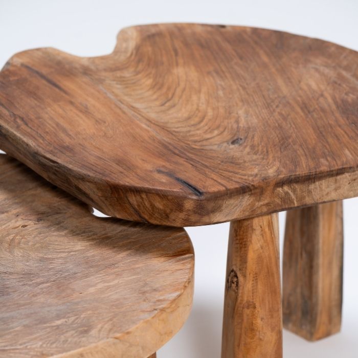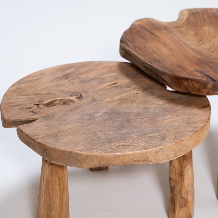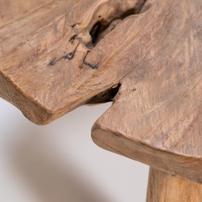 הכניסו חמימות ואופי ייחודי לביתכם עם שולחן כפרי עגול, עשוי בעבודת יד מעץ טיק איכותי. כל שולחן הוא יצירה חד-פעמית, עם טקסטורה טבעית, קווים אבסטרקטיים