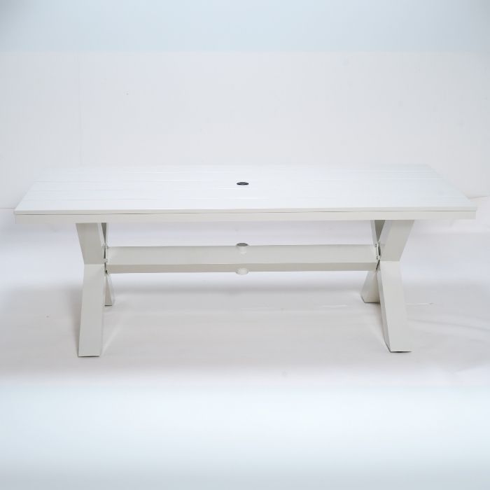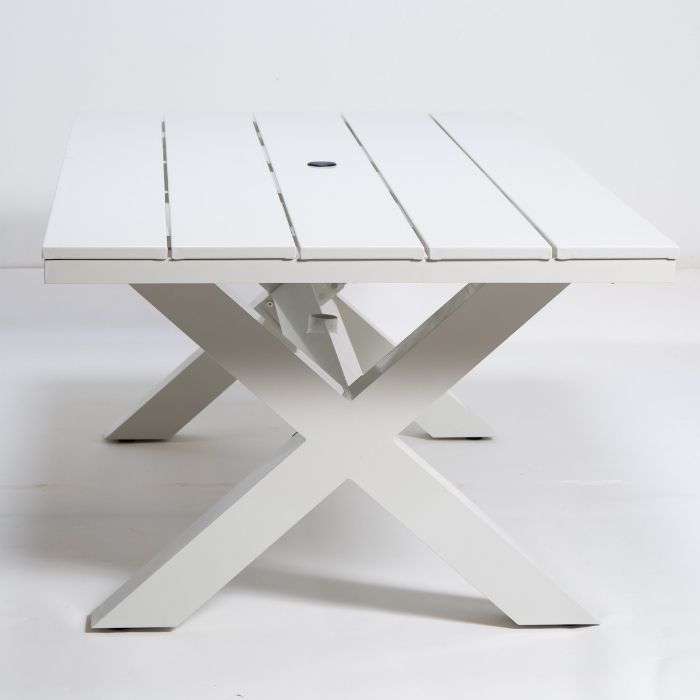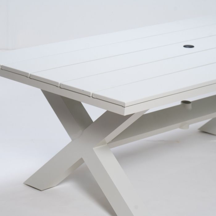 שולחן אלומיניום איכותי בצבע לבן קלאסי, אידיאלי לשימוש חוץ בכל מזג אוויר.